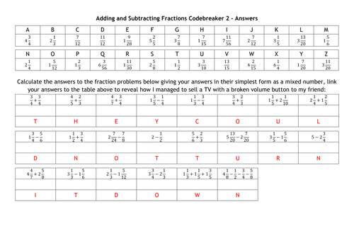 Adding And Subtracting Fractions Codebreakers | Teaching Resources from www.tes.com